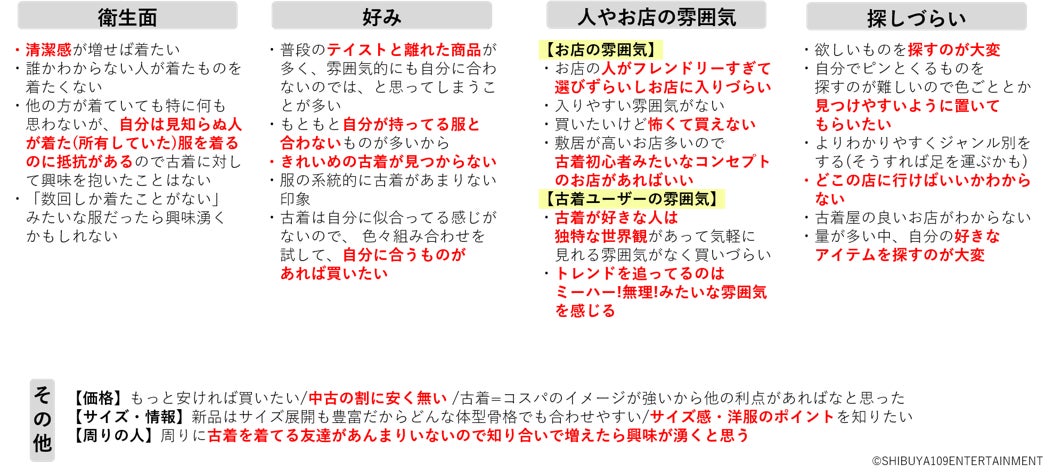 一方で、古着ユーザーのSHIBUYA109 lab. EYEZメンバーからは「古着屋は内装が可愛いことも多い。購入しなくても楽しい場所として知ってもらい、フラッと立ち寄ってほしい」といった声もありました。