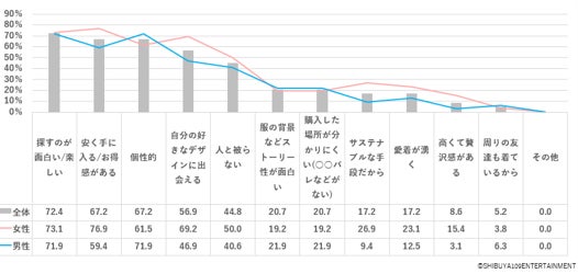 男女別で見ると、男性は「個性的(71.9%)」「探すのが面白い/楽しい(71.9%)」の数値が特に高い一方で、女性は各項目の数値が高く、様々な魅力を感じて古着を利用していることがうかがえました。