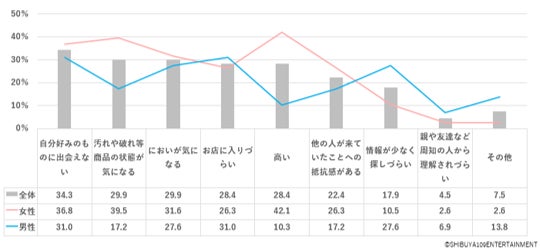 男性の場合は「自分好みのものに出会えない(31.0%)」と「お店に入りづらい(31.0%)」が同率1位、次いで「情報が少なく探しづらい(27.6%)」となり、お店の入りづらさや情報の少なさが主なハードルとなっていることがわかります。