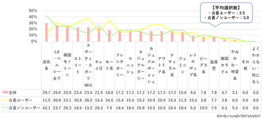 男性の場合※図1、古着ユーザーも古着ノンユーザーも「キレイ目」「カジュアル」がTOP2となりましたが、古着ユーザーは平均3.0個のファッションジャンルを選択する一方で、古着ノンユーザーは平均1.7個選択しており、古着ユーザーはより多くのファッションジャンルを楽しむ中で、「古着」も楽しんでいることがわかりました。