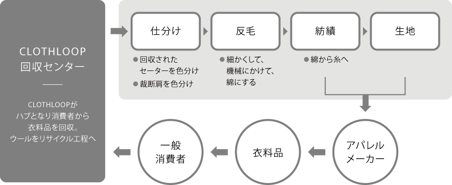 そこで、私たち三井物産アイ・ファッションは、回収した衣料品を再資源化する 取り組み「CLOTHLOOP」をスタートしました。役割を終えたあとの衣料品を回収。