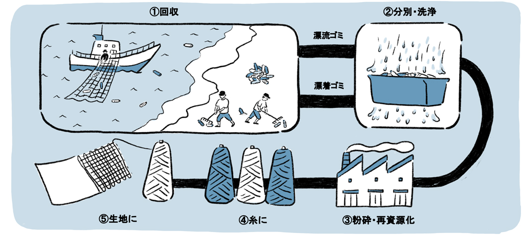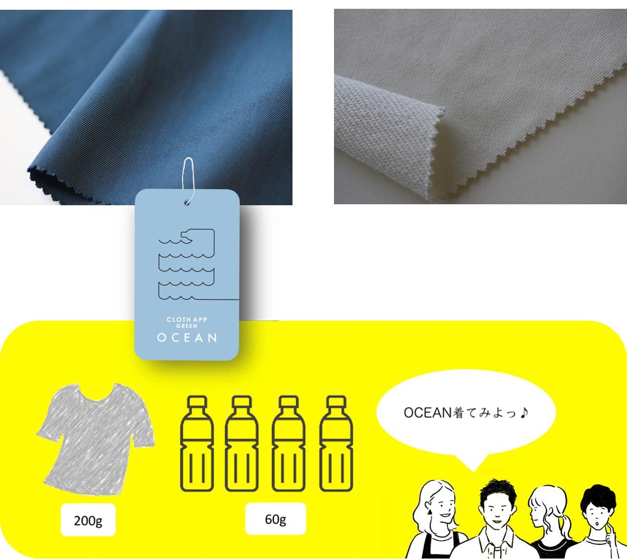 そういうわけで、私たちは海に漂うペットボトルやごみ袋、包装容器や漁網から分別されたリサイクル原料を使用して「OCEAN」という生地をつくったのよ。