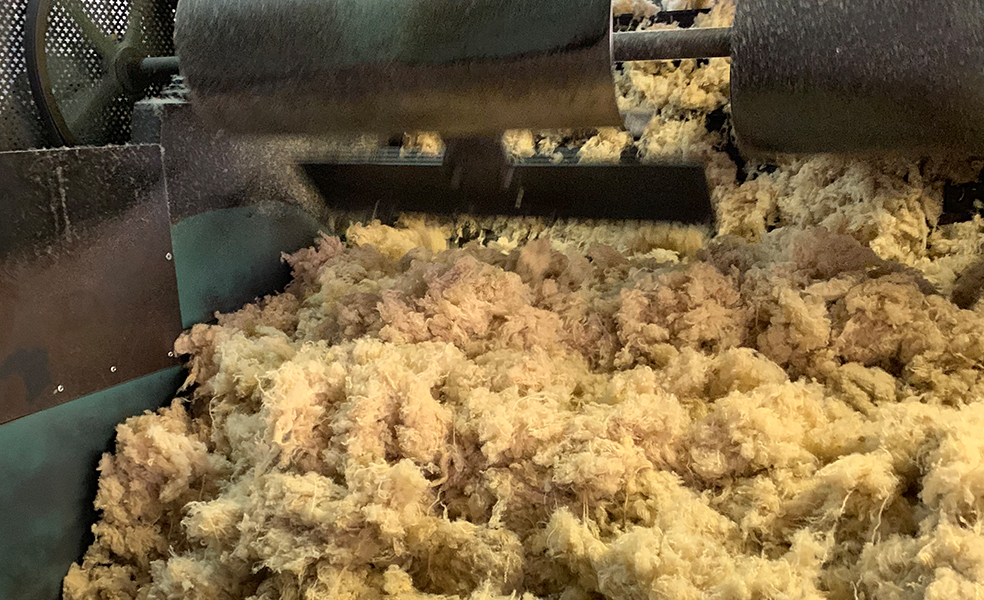 裁断くずや残糸をほぐして、もう一度綿状に戻す「反毛工程」