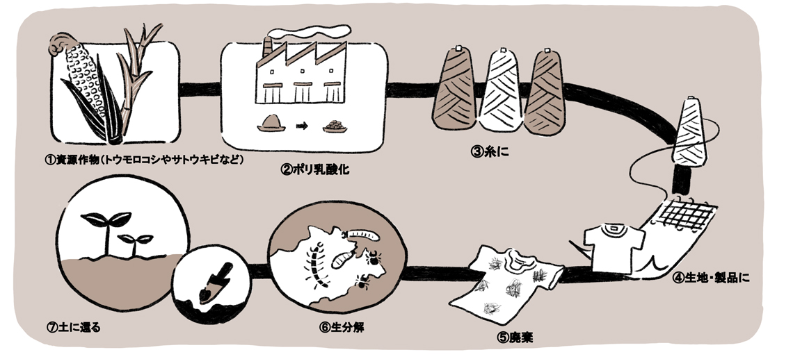 BIOは、トウモロコシやサトウキビなんかのデンプンからとれる乳酸を原料にした「ポリ乳酸繊維」をメインに使った生地なんだ。