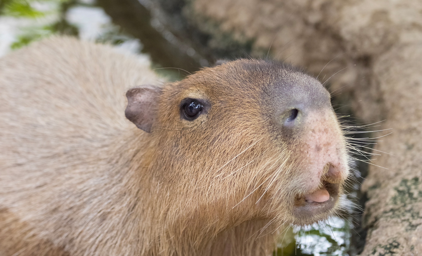 動物園では、水につかってのんびりくつろぐカピバラをよく見かけます。もともとカピバラは水辺で水草などを食べてくらし、交尾や排泄も水中で済ませるほど水になじんだ生き物。指の間には水かきも備わっています。