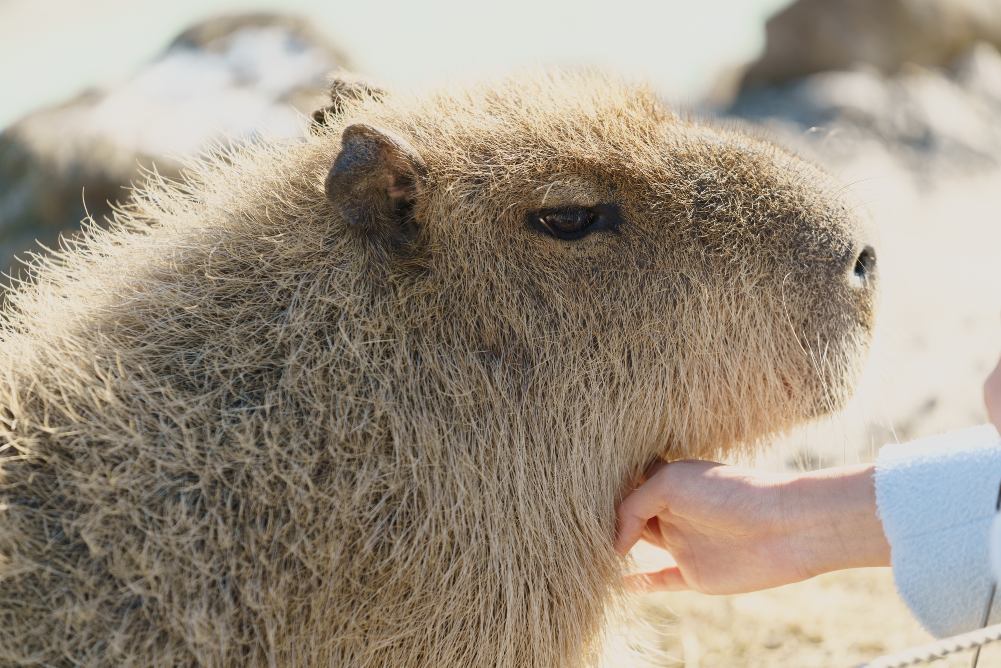 カピバラの手触りは、予想に反して硬くごわごわ。それもそのはず、長さ5㎝ほどのカピバラの毛はタワシのように固くて太いのです。タワシは水切れがよく、ピッと振るだけで水気が飛んで乾きますが、カピバラの毛もタワシのような作用が働くうえ、毛に弾力があるため、はじき飛ばす効果も増します。また、毛の密度が低く通気性も抜群で、皮膚についた水気も振り払いやすく、より乾きやすいというわけです。