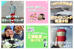 SHIBUYA109lab.EYEZでは公式インスタグラムを運営。SHIBUYA109lab.メンバーがフォローしながら、学生メンバーが見つけてきた「ネタ」や、定例会で学んだ内容などについて発信を行います。サステナブルなアクションの後押しをすることを目的に、Z世代ならではの視点でのコンテンツ化・フォロワーの方とのコミュニケーションを重視した運用を行っています。